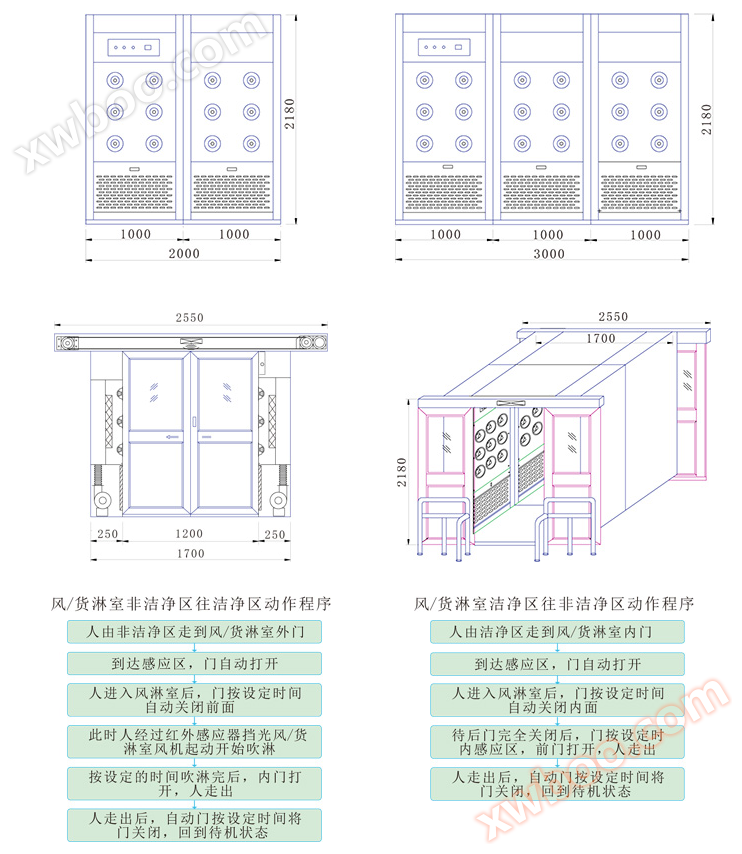 Bilik pembersihan - bilik pembersihan pintu beralih automatik adalah saluran yang diperlukan untuk barang memasuki bilik bersih, ia boleh mengurangkan masalah pencemaran yang disebabkan oleh barang memasuki dan keluar dari bilik bersih. Dua pintu elektronik saling mengunci bilik mandian, boleh memainkan peranan bilik pintu gerbang udara, mencegah udara yang tidak dibersihkan memasuki bilik bersih, bilik mandian suara pintar teknologi tinggi dilengkapi dengan sistem isyarat suara, apabila ditiup oleh sistem isyarat suara automatik, isyarat suara manusiawi memberi perasaan ramah dan mencapai kesan pembersihan yang berkesan, aliran udara bersih selepas penapis yang cekap disemburkan dari muncung berputar dari semua arah ke permukaan objek, zarah debu yang berkesan dan pantas *, dengan zarah debu udara kemudian ditapis semula ke kawasan mandian udara selepas penapis awal dan cekap.